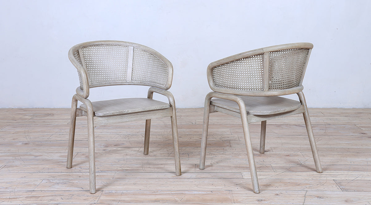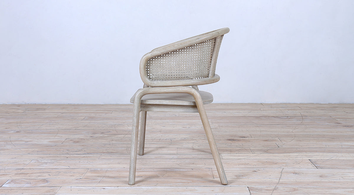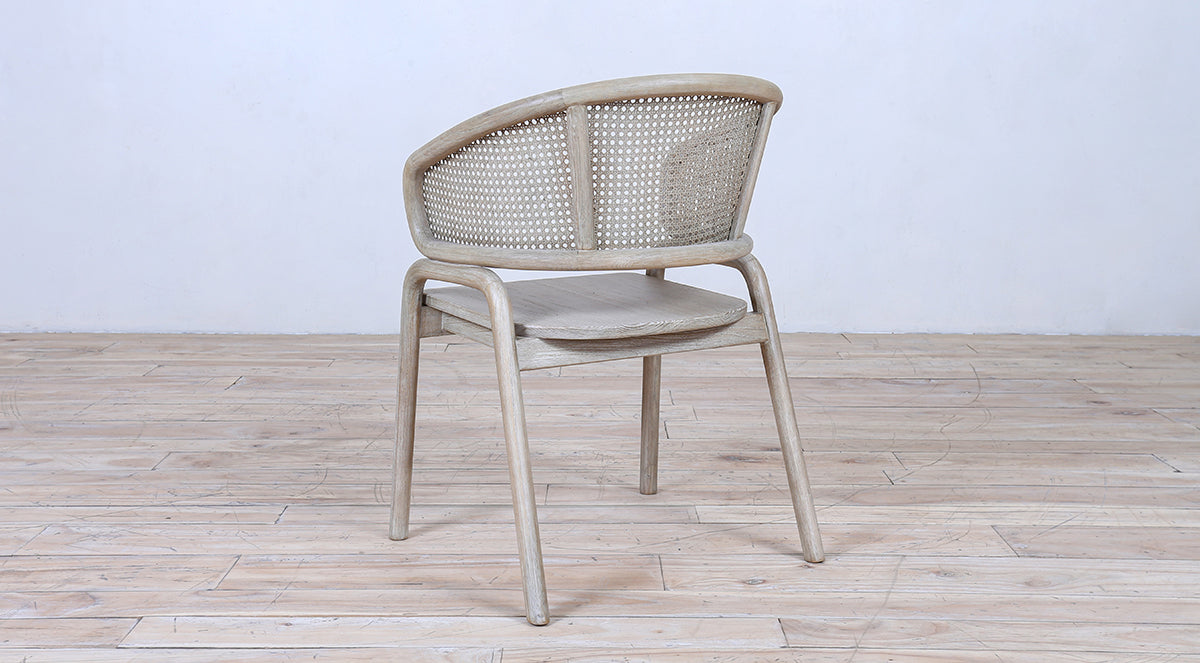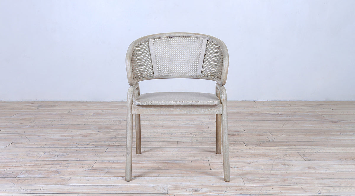 A stylish wooden armchair featuring a curved cane backrest and a smooth wooden seat. Its natural finish and clean design make it perfect for dining rooms, patios, or modern living spaces.