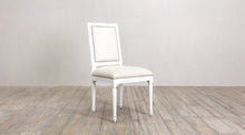 Vintage French Square Side Chair is made from mahogany wood and with white sand trugh finish. the nail heads are the design feature for the chair. It is square shape back. it is a great dining chair.