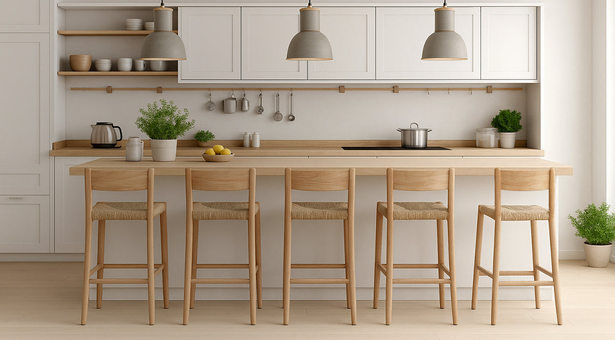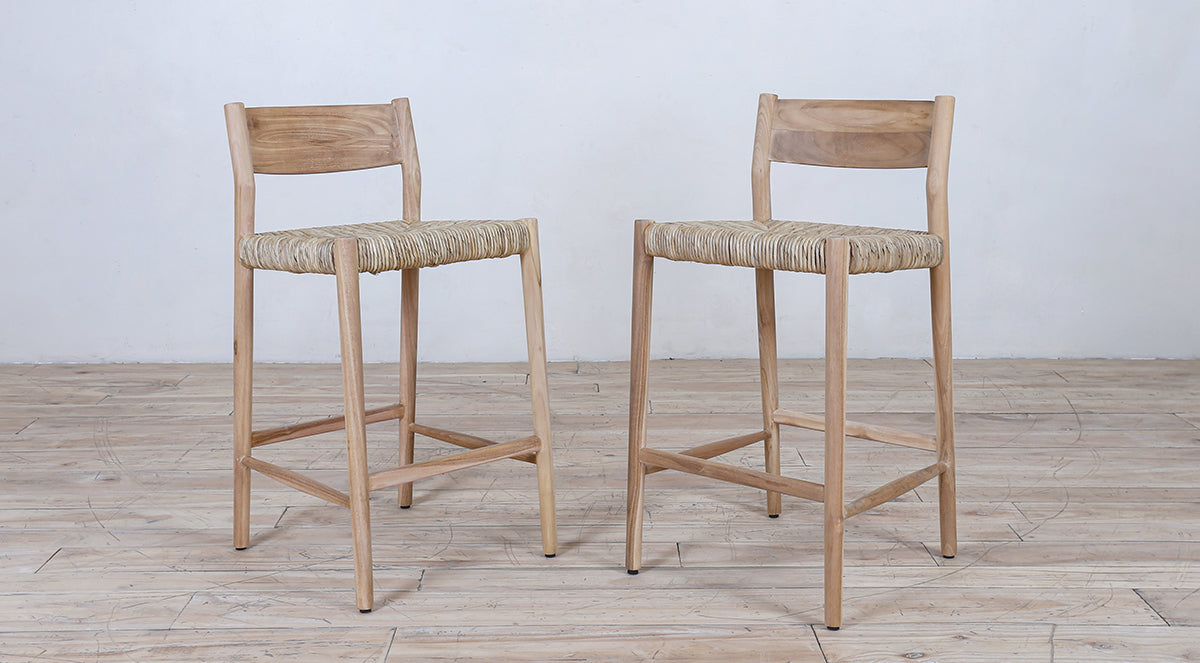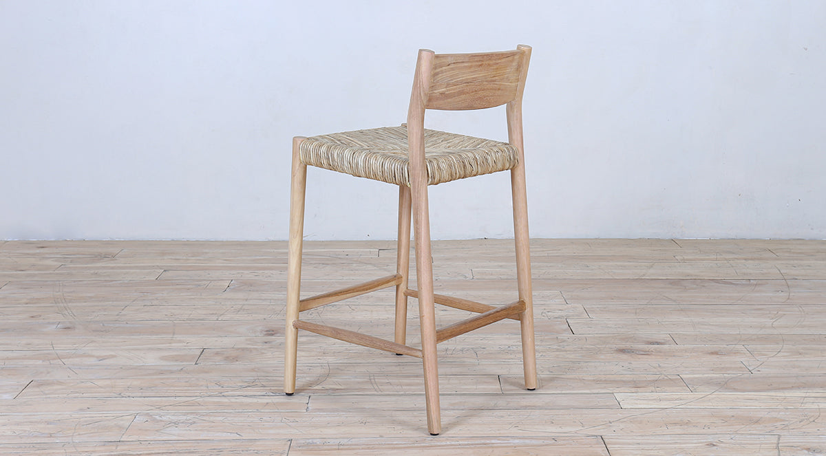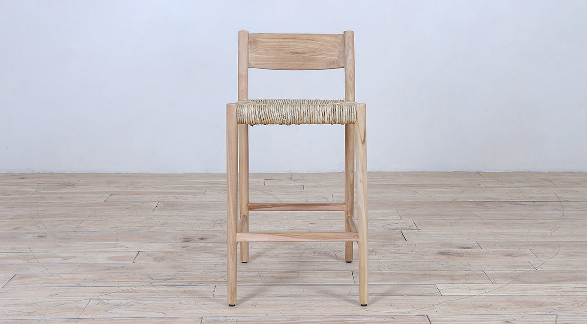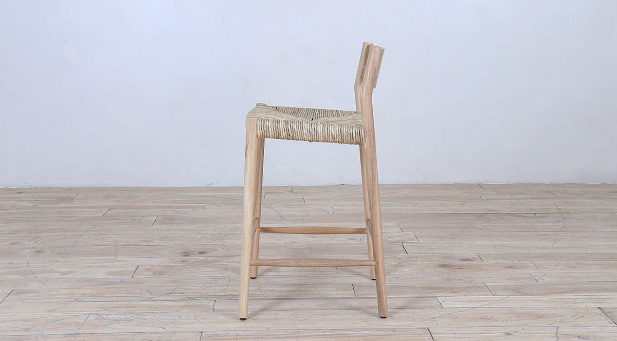 This elegant bar stool features a solid wooden frame with a smooth natural finish and a handwoven rush seat. Designed with a minimalist backrest and sturdy footrest, it combines comfort with timeless style—perfect for kitchens, dining areas, or home bars.