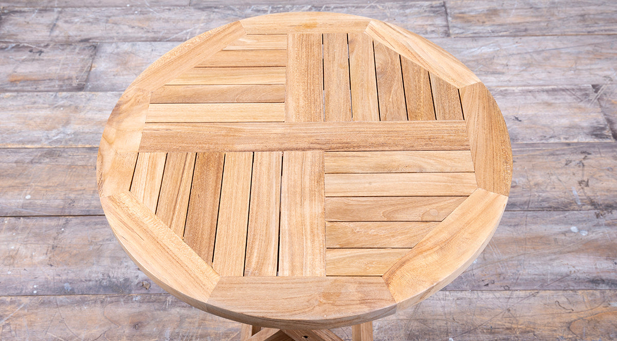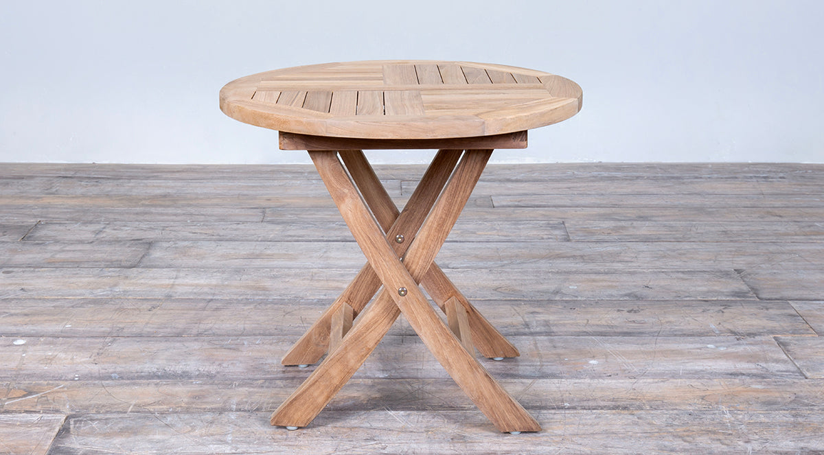 Constructed from sturdy teak wood with a natural finish, the Round Folding Table offers a blend of durability and refined design, ideal for outdoor, garden, or patio settings.