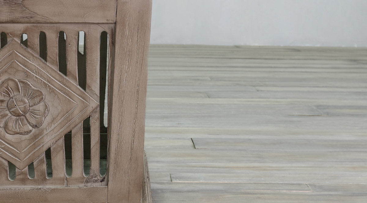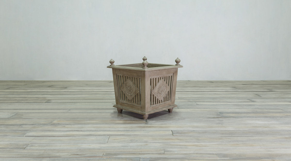 Planter is made from the teak wood and with frontier finish. The vertical slats pattern on the planter creates an open so the other pot can be seen through the slats. It also has a diamond pattern with flower in the middle. The legs and four top spindles are making a decorative statement. You can use this planter on the patio, deck , garden or on the porch. Beautiful rose bushes on the entryway put into this planter can adorn any house. It can also be used as umbrella or a cane holder.